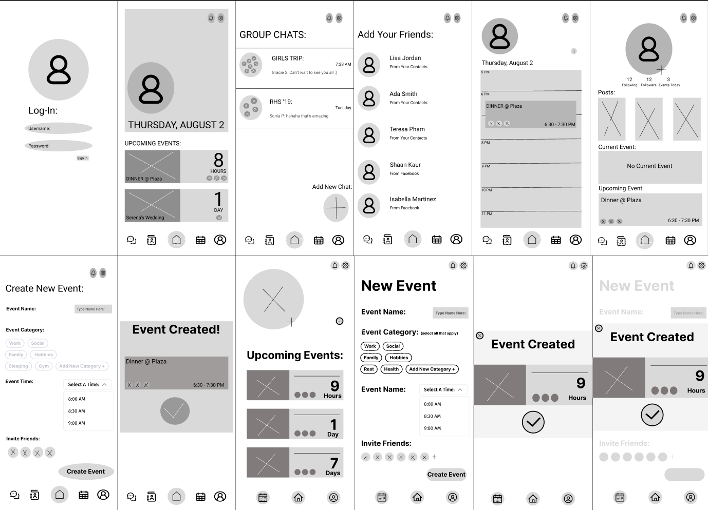 I then developed the ideation sketches into a low-fidelity prototype for the sign in, home, group chats, add friends, calendar, and profile pages. I then created the happy path for adding a new event to the calendar.